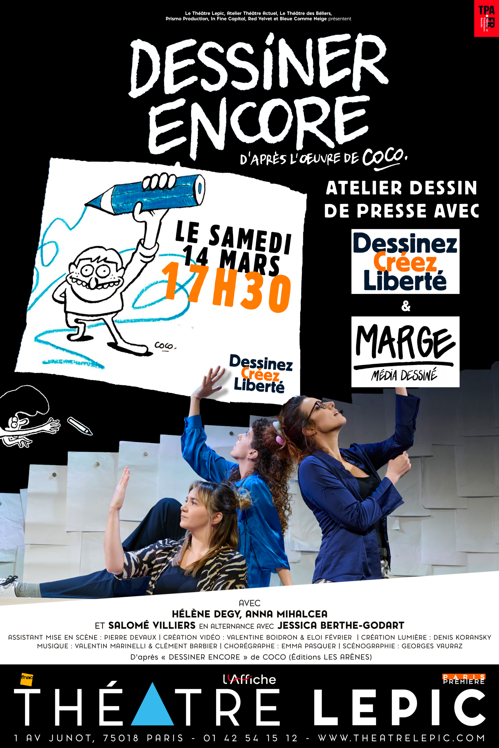 Dans le cadre des représentations de la pièce « Dessiner Encore » adaptée du livre de la dessinatrice Coco, l’association Dessinez Créez Liberté et le collectif Marge vous proposer de vous essayer au dessin de presse le samedi 14 mars 2026 avant la représentation du soir à 17h30. Pas besoin de penser savoir dessiner, il suffit de venir avec des choses à exprimer et avec vos coups de gueule !